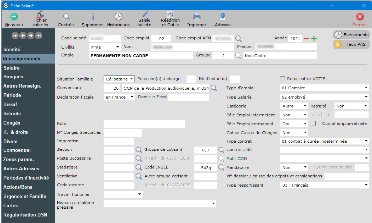 Les groupes de cotisants sont gérés, dans la fiche salarié, au niveau de l’onglet « Renseignements », dans la rubrique « Groupe de cotisant » (ainsi que, pour les salariés retraités, dans la rubrique « A partir du 01/07/2009 »).