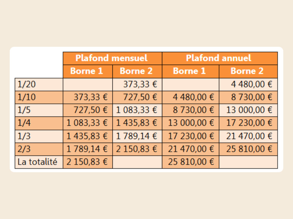 Les seuils des barèmes ci-dessus sont augmentés de 1740,00 € annuel (145 € mensuel) par personne à charge.